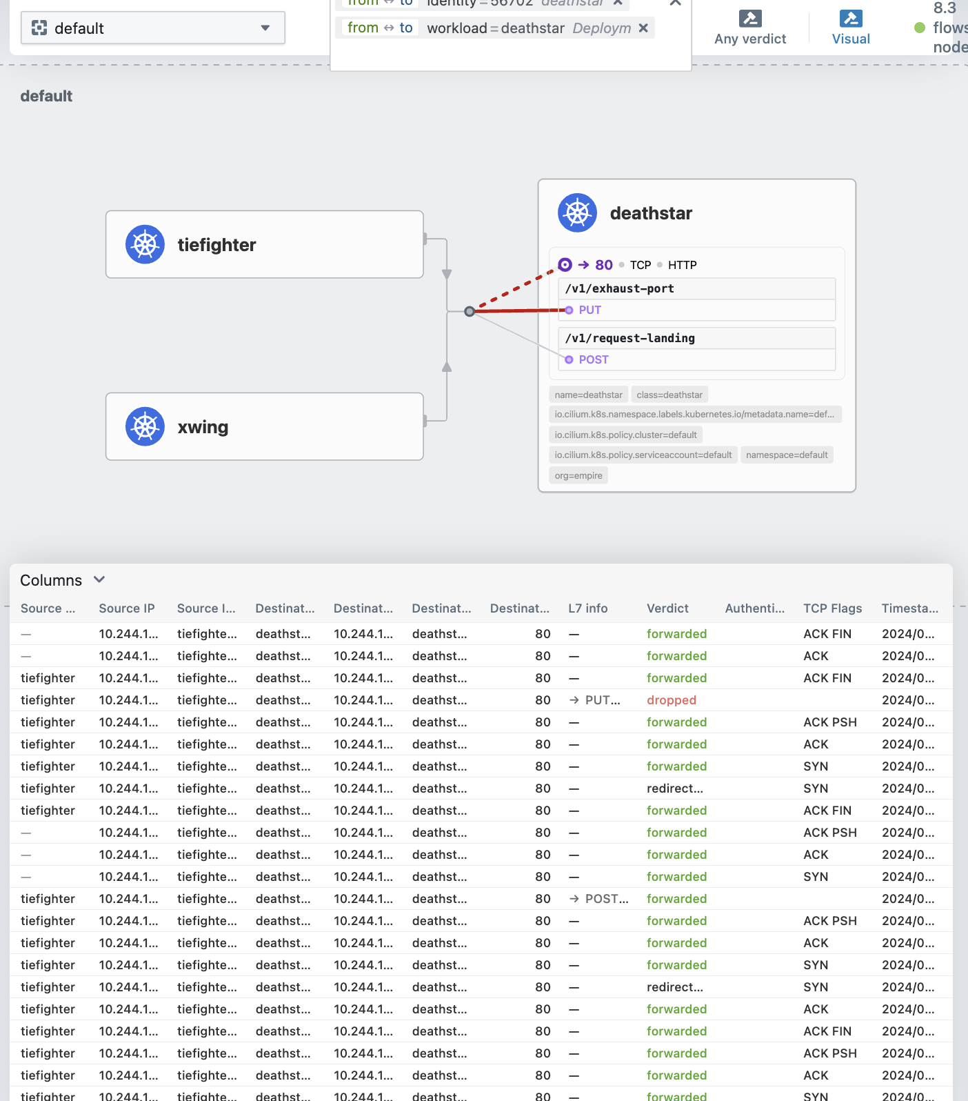 Cilium은 HTTP게층(L7)정책을 시행하여 tiefighter가 도달할 수 있는 URL을 제한할 수 있다.